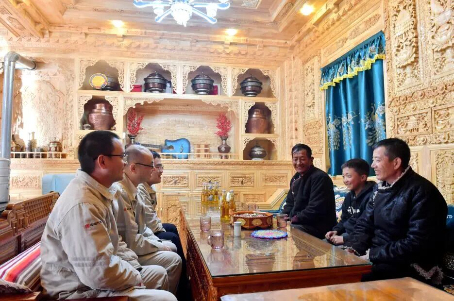 西藏大唐扎拉公司移民管理部中级主管向巴扎西(右二)走访群众。记者 温凯 平措朗加 摄